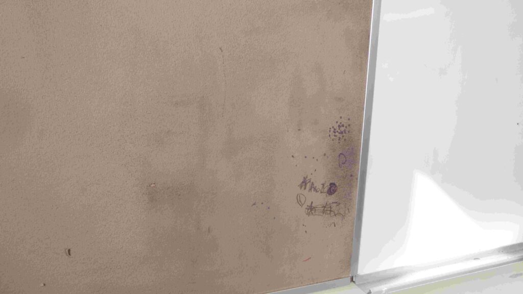 その後、特にこのようなことはなかったのですが、先日、センター集会室の壁やロビーの本に落書きらしきものが見つかりました。