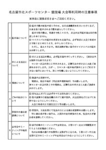 私どもは、引き続き当日対応を行ってまいりますが、大会主催者の皆さまにおかれましても、これまで以上に役員・選手・応援でご来場の皆さまへ「公共交通機関を利用し、自動車での来場をお控えいただくこと」のお願いを強化していただくとともに、大会当日の周辺道路交通整理要員をあらかじめご用意いただくなど、北スポーツセンター周辺にお住いの皆さまへご迷惑をおかけしない館の運営(及び大会の開催)にご協力いただきたいと存じます。