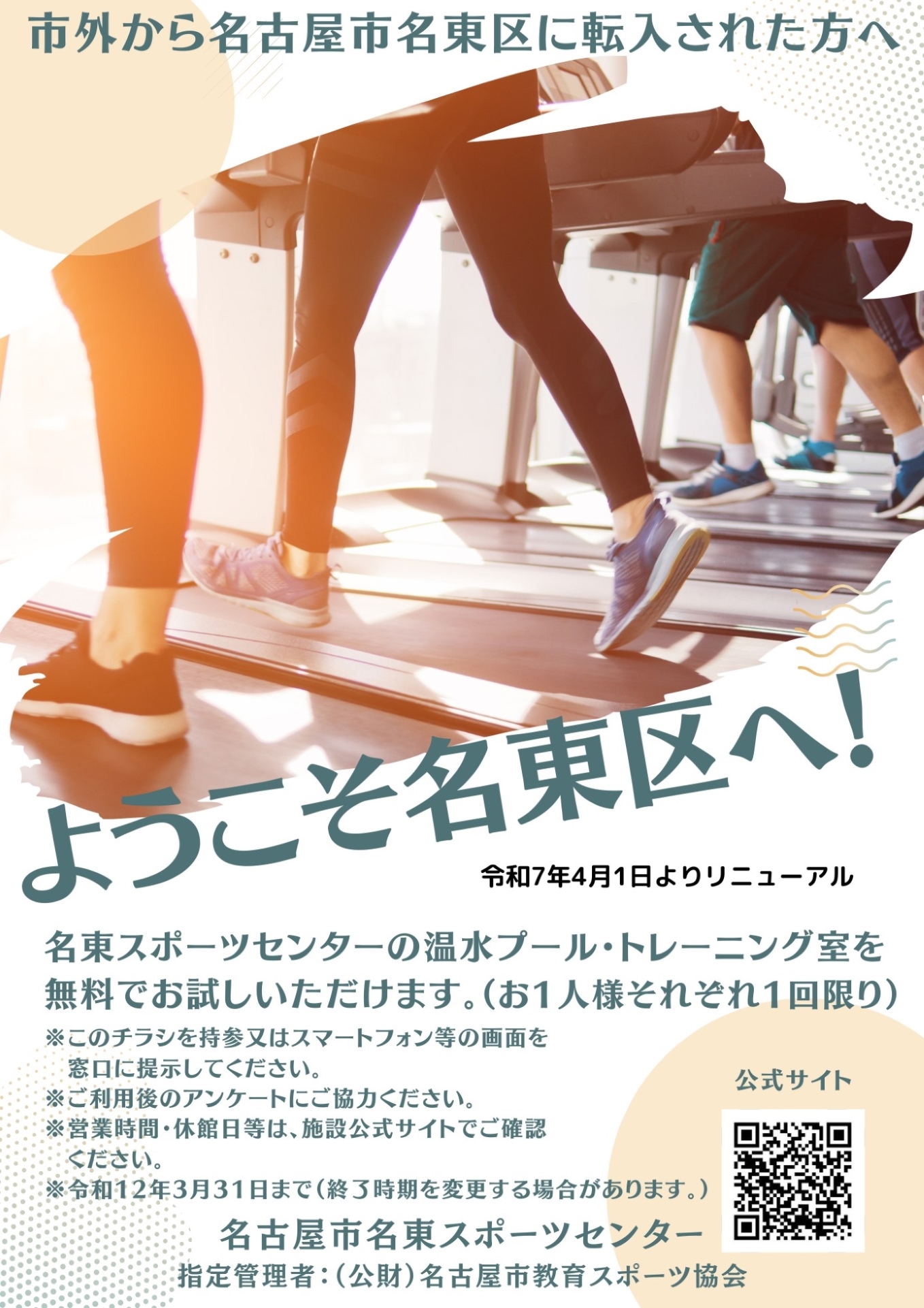 名古屋市名東スポーツセンターでは、市外から名古屋市名東区内に転入された方を対象に、温水プールとトレーニング室を初回無料でご体験いただける「ウェルカムチケット」をご用意いたしました。ぜひこの機会に、名古屋市名東スポーツセンターの魅力をご体感ください!