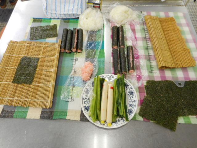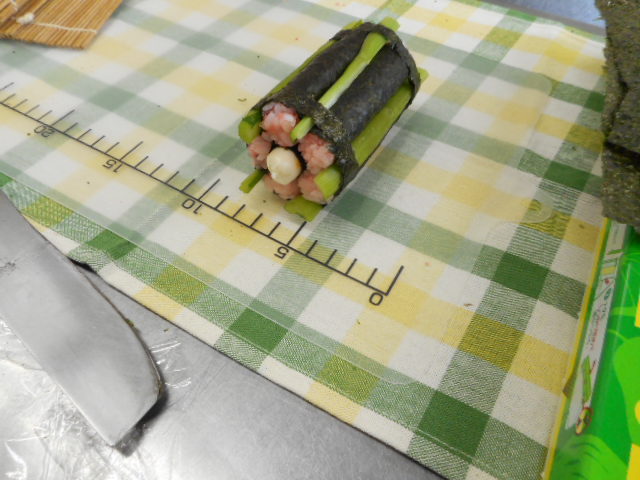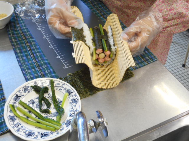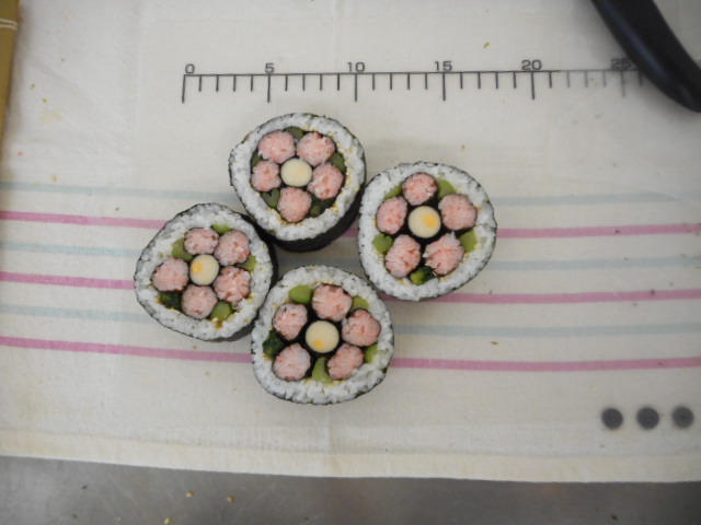 小さな巻き寿司を作り,それをまたひとつにまとめてから大きな巻き寿司を作り,かわいい飾り巻き寿司のできあがりです。食卓に,また一つ花が咲きました。