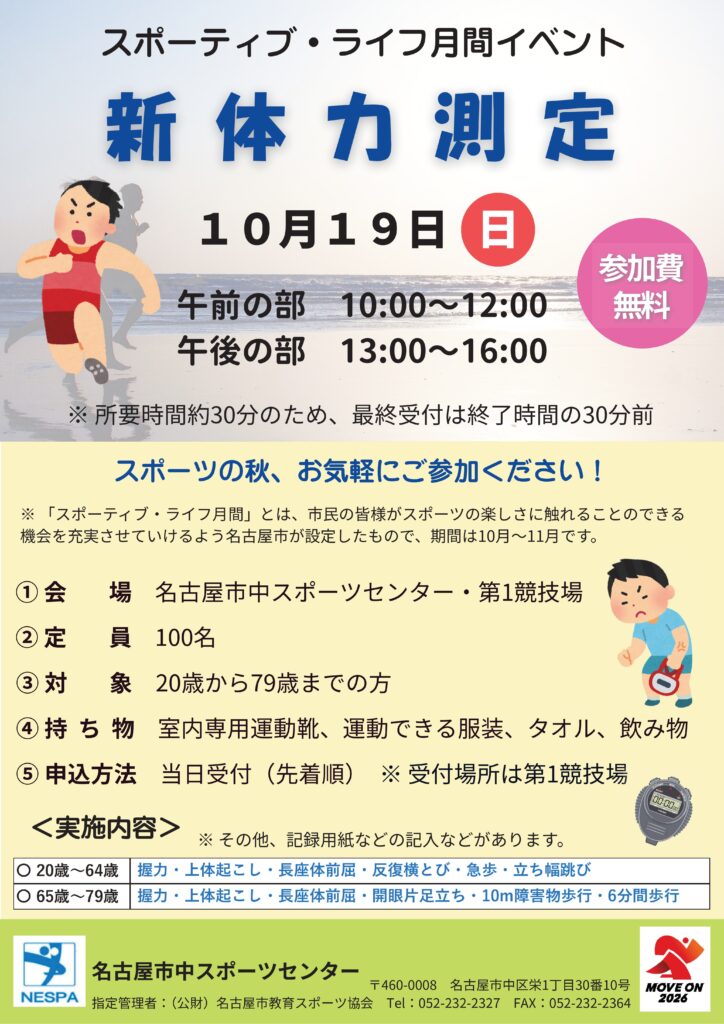 スポーティブ・ライフ月間イベント「新体力測定」を実施します!! 2025年10月1日 水曜日 いつも名古屋市中スポーツセンターをご利用いただきありがとうございます。 10月19日(日曜日)にスポーティブ・ライフ月間イベント「新体力測定」を実施します! 詳細は以下のとおりです。 お気軽にご参加ください^_^