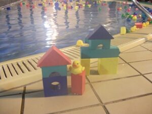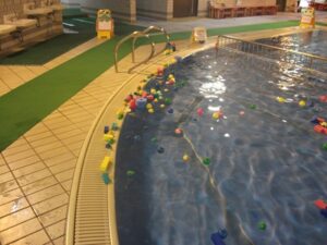 幼児用プールにおもちゃを浮かべ、11時から「ワンポイントアドバイス」を実施しました。