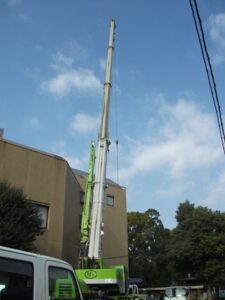 施設の天井にある、ガスを使って冷暖房する機械の取替のため、大きなクレーン車が止まっています。