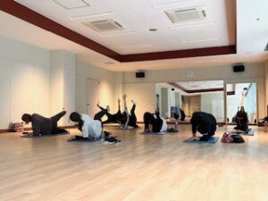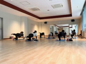 レッスン中は、インストラクター EMI先生 の明るく元気な号令に合わせて、骨盤の歪みを整えるエクササイズ(骨盤まわりを中心に筋トレ・腹筋や体幹トレーニング)とストレッチを行い、身体のバランスを整え不調改善に、取り組まれていました。