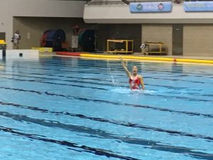 飛込の次は、日本泳法です。自然の中で生まれ、500年の歴史を持つこの種目は、現在においても各流派ごとで進化し続けています。立ち泳ぎをしながら、傘を広げたりするなど、さまざまな演技を披露。その動きは、時には激しく、時には繊細かつ無駄がない、まさに水と一体化しており、日頃からの鍛錬がうかがえました。