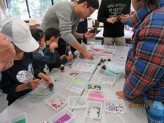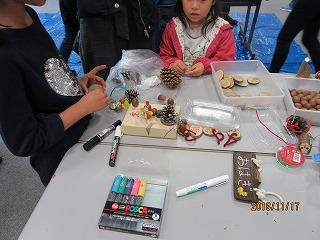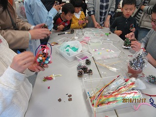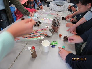 昭和区子ども会育成連絡協議会の方々の指導による、クラフト教室も行いました。松ぼっくりやどんぐりなどを使った、かわいらしいツリーなどを作りました。