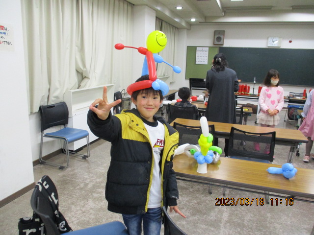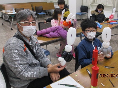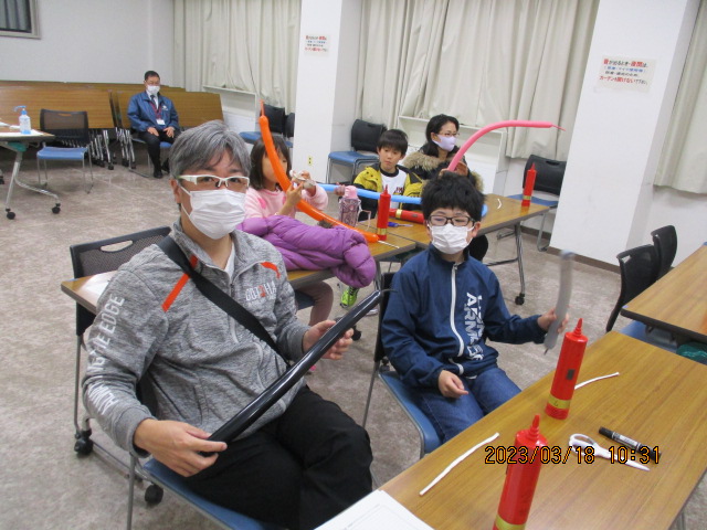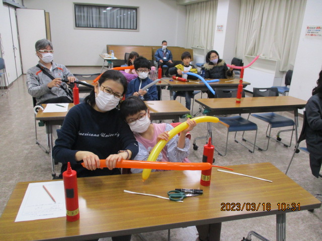 3月18日(土)午前10時から正午、NESPA主催事業「親子孫で楽しくバルーンアートづくり」を視聴覚室で開催しました。講師は、トワイライトスクールやデイサービスでも人気の「風船くらちゃん」さんです。
