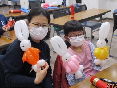 参加した4組10名は、最初に講師の風船くらちゃんさんから「うさぎ」の作り方について説明を受けた後、家族でそれぞれに制作を行いました。何個も風船が割れて苦労する場面もありましたが、それぞれにステキな「うさぎ」を作ることができました。最後にくらちゃんさんの作品をお土産にもらって、楽しい時間が終わりました。バルーンアートとともに、家族で楽しい思い出も作れたことと思います。