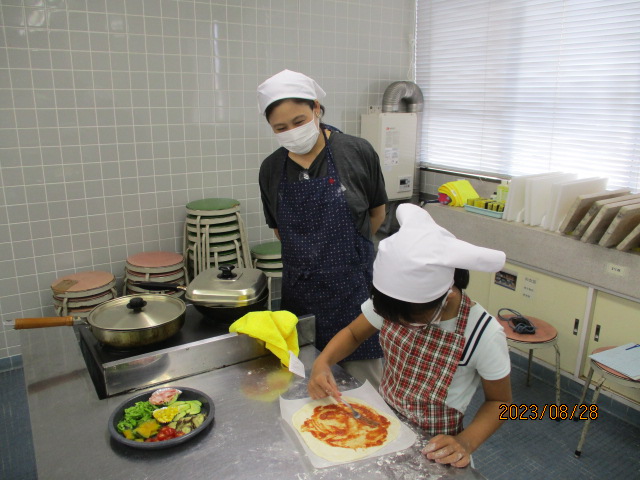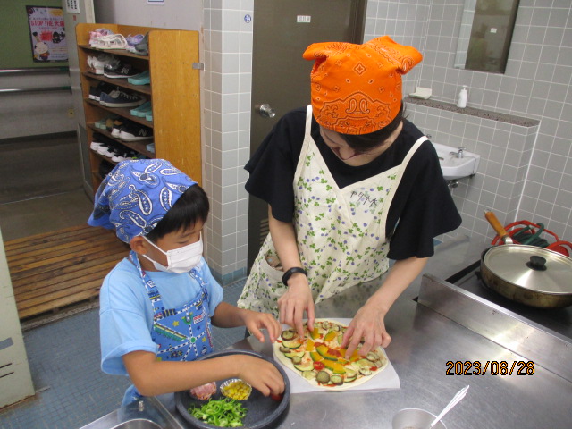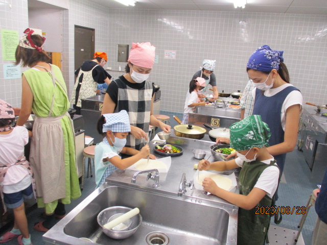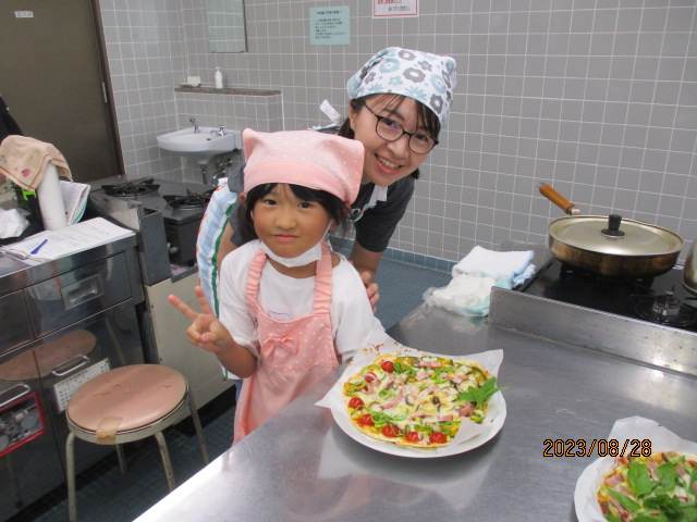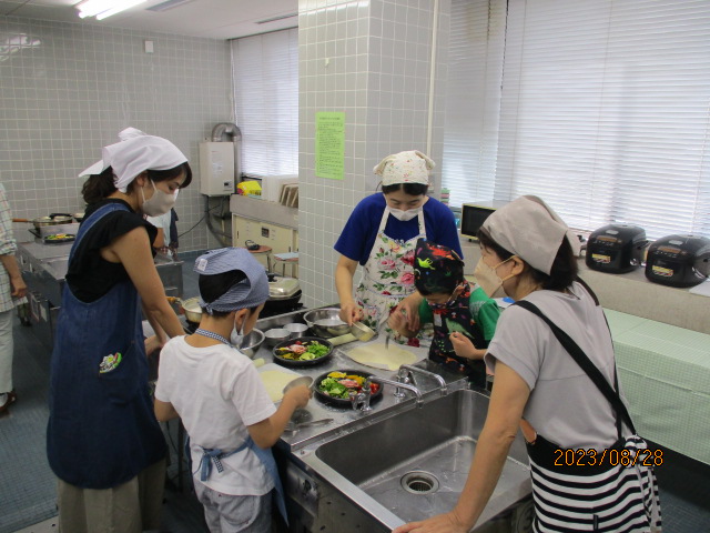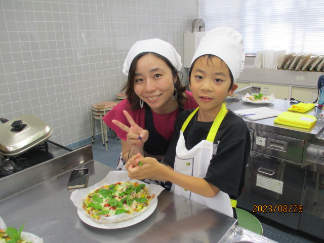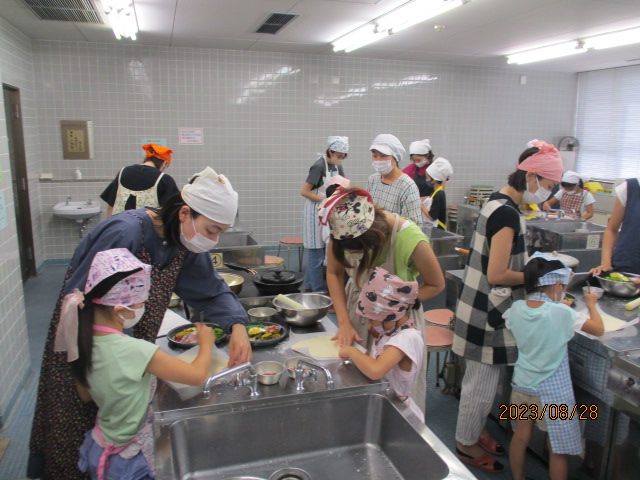 8月28日(月)午前10時から正午、NESPA主催事業「楽しく食育! 親子クッキング~『夏やさいピザ』をつくろう~」を料理室で開催しました。講師は、元小学校栄養教諭の加佐原明美さん、加藤明美さんです。