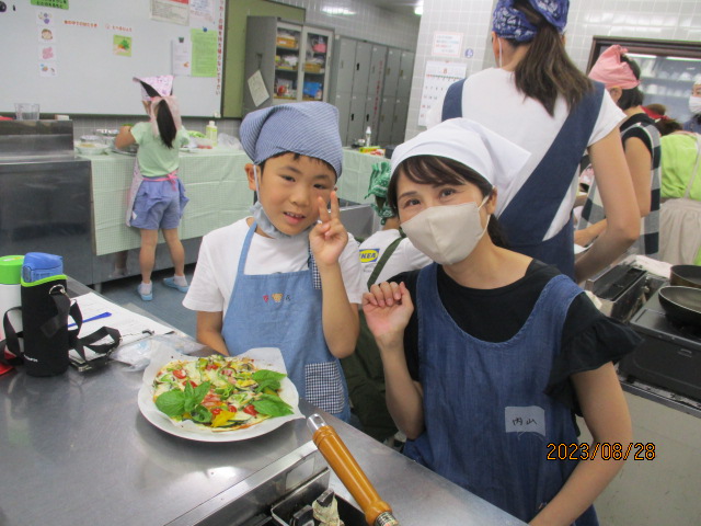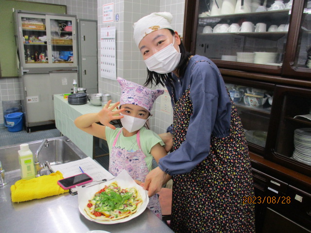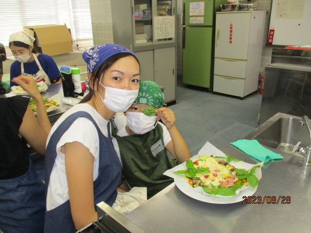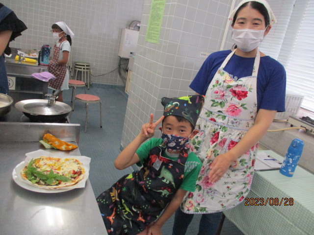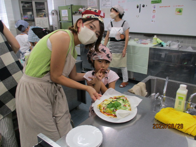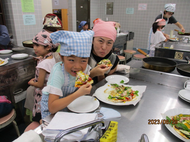 「いつもは食べられない嫌いな野菜(なす・ピーマン)も『おいしい!!』と言って食べていたことに感動しました。改めて、食育の大切さを感じる時間となりました。」「親も一緒に学べて勉強になりました。」などの声が聞かれました。夏やさいピザとともに、親子で楽しい思い出も作れたことと思います。