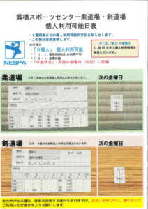 柔道場・剣道場の1週間分の個人利用可能日をお知らせします。1週間以上先の予定については、電話でお問合せいただいても変更の可能性があります。