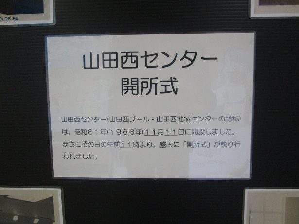 なお山田西プールでは、開設された昭和61年(1986年)11月11日に、盛大な「開所式」が行われました。その当時の風景写真も展示しています。開始時刻も午前「11」時でした。